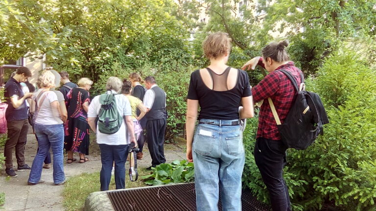 Anders als wir bisher dachten gibt es einen Zugang von außen in den grünen Innenhof. Ein Workshopteilnehmender bestätigte, dass der mit etwas Aufwand barrierefrei gestaltet werden kann.